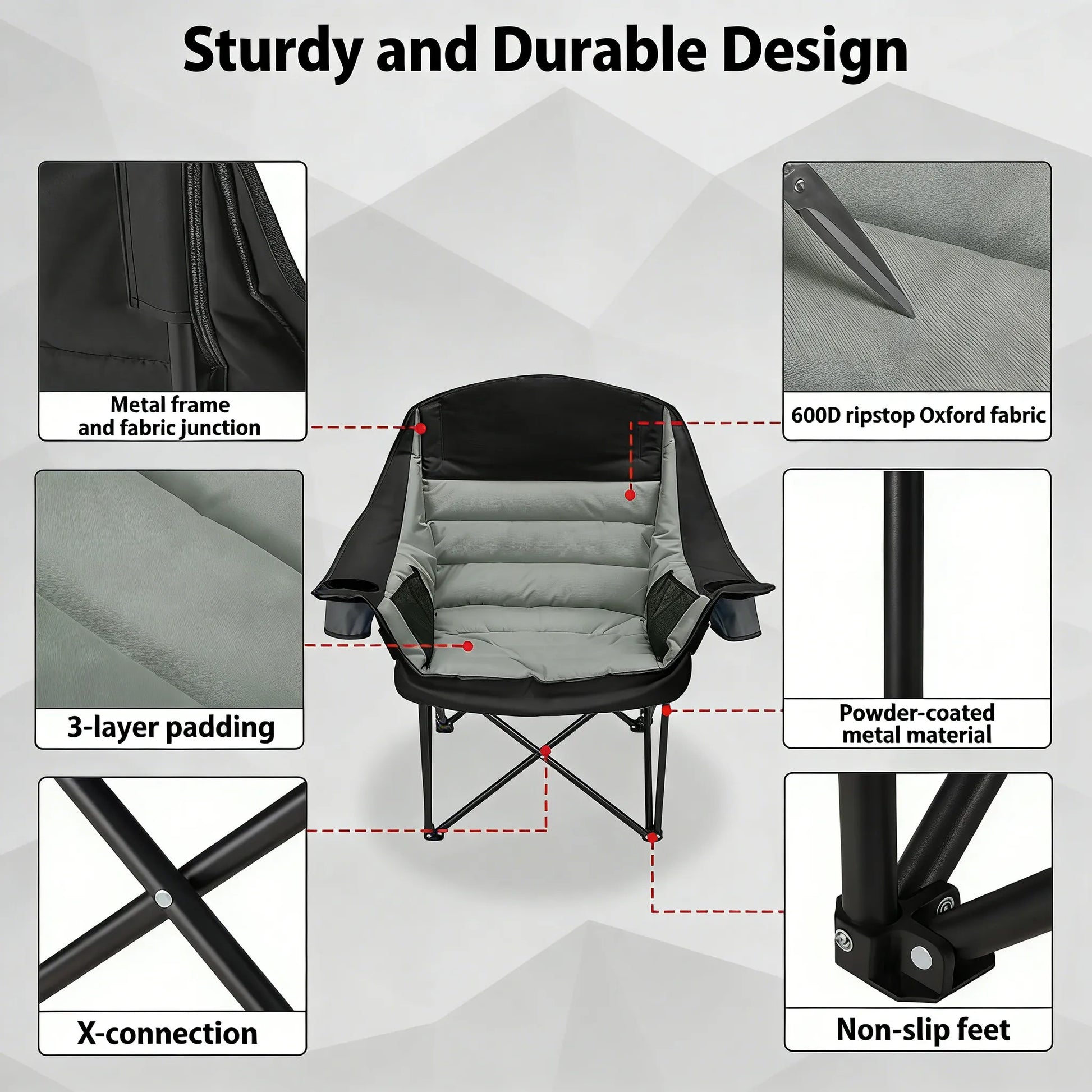Durable and Sturdy: Built with a solid steel frame and newly enhanced support components, this chair supports a weight of up to 400 pounds. The steel frame’s powder-coated finish protects against rust and fading, while the 600D tear-resistant Oxford fabric, which is tightly stitched and breathable, enhances long-term durability. This chair will stay stable and perform well over time.