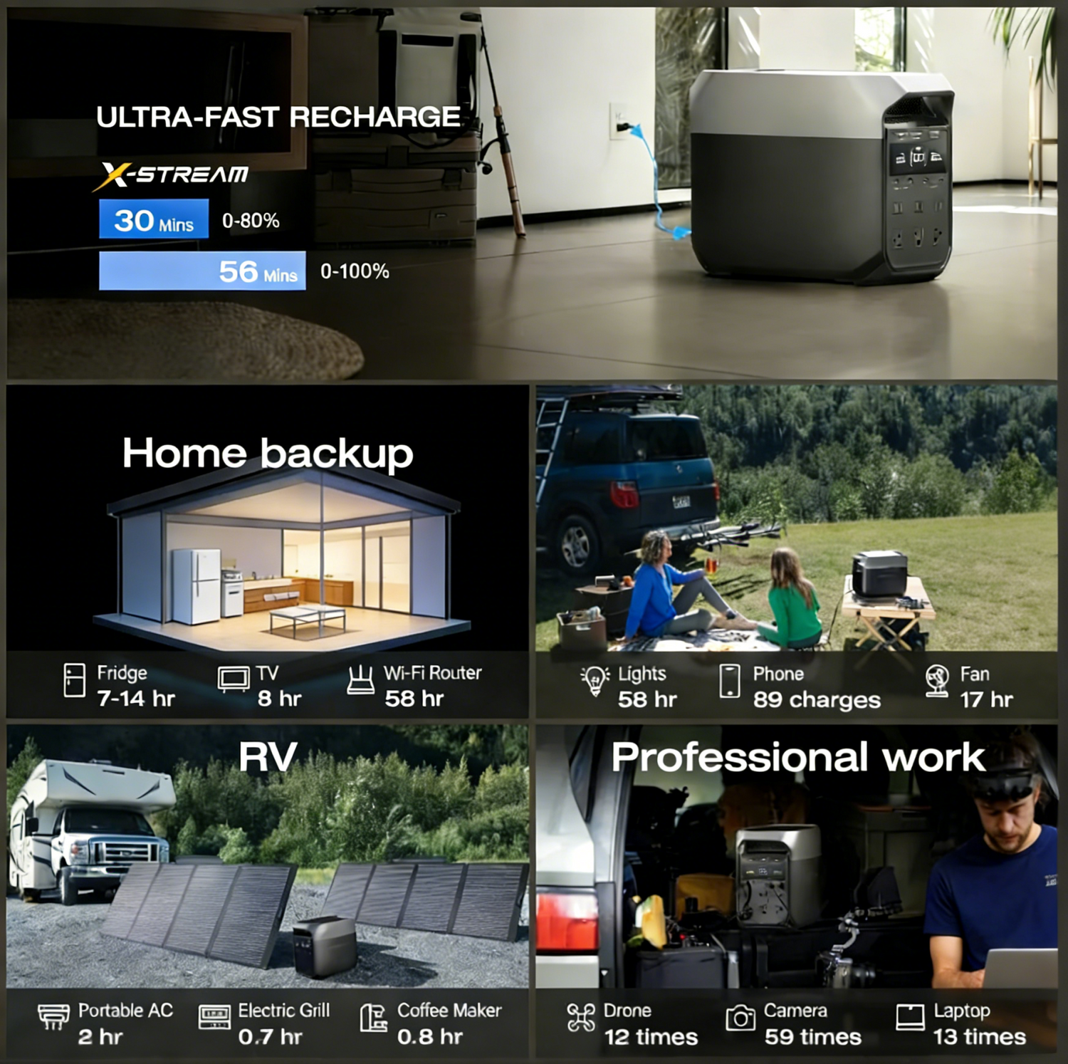 Coffee time = 80% charged One episode = Full day power 5 Charging Options Wall | Solar | Car | Generator | Anderson Charging